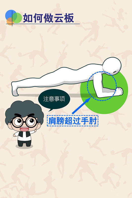 肩膀在肘部上方,保持腹肌的持续收缩发力(控制住),保持臀部不高于肩部,脚之间与肩同宽。